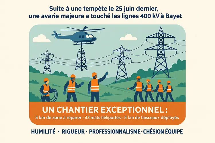 Suite à la tempête du 25 juin dernier, une avarie majeure a touché les lignes 400 kV à Bayet, nécessitant un chantier exceptionnel : 5 km de zone à réparer, 43 mâts héliportés, 5 km de faisceaux déployés, et plus de 160 personnes mobilisées, de tous les établissements et de plusieurs régions.